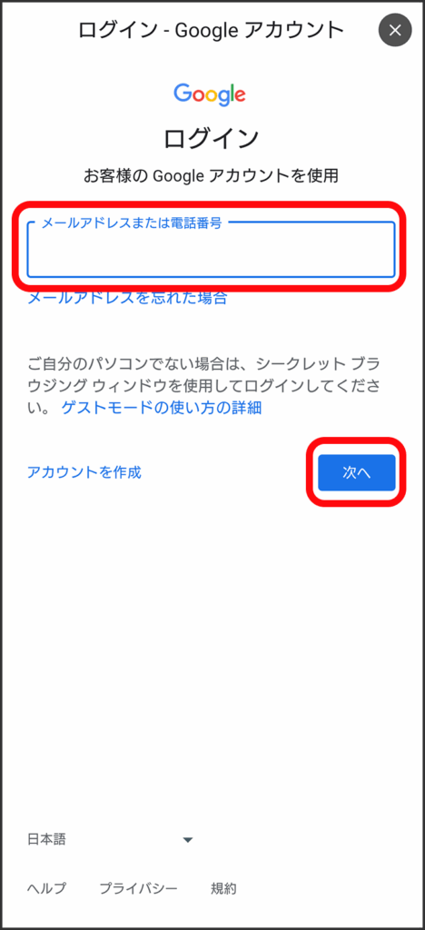 6.Googleアカウントに登録してあるメールアドレスまたは電話番号を入力し、「次へ」をタップ
