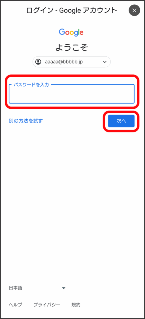 7.Googleアカウントのパスワードを入力し、「次へ」をタップ