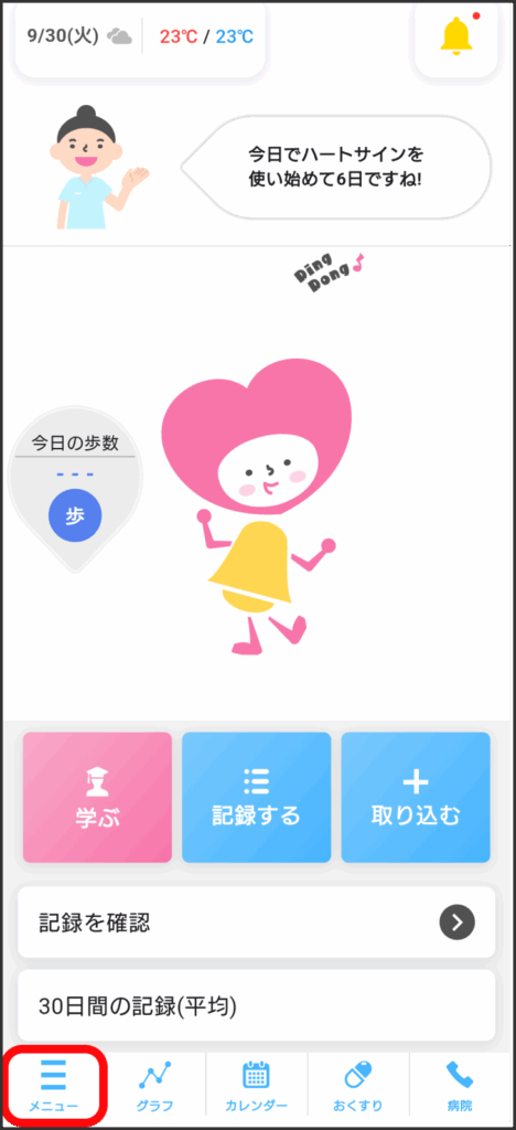 1.「ハートサイン」アプリを起動し、「メニュー」をタップ