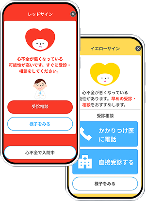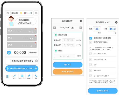 血圧・脈拍・体重・症状を入力します。数値や症状によって増悪スコアを算出。早期の受診が必要な場合にはサインが表示されます。