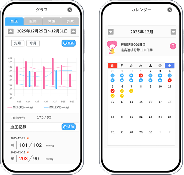 血圧・脈拍等の記録が自動グラフ化されます。アプリと連携したスマートフォンやウェアラブル端末を携帯することで自動的に歩数カウントを記録します。カレンダーから過去の記録を確認することができます。