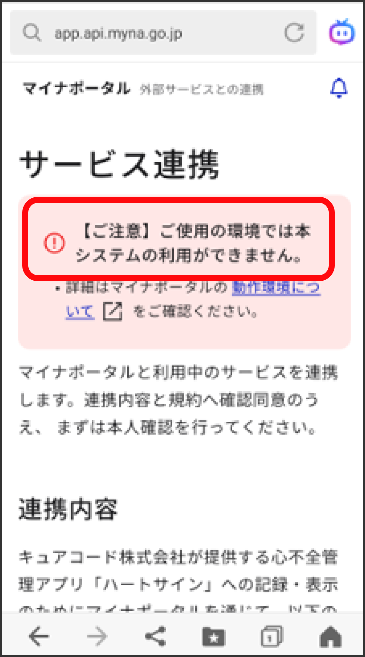 マイナポータルの画面(下の画像)で、「この環境では利用できません」と表示され、連携できない場合は、スマートフォンの「設定」アプリからデフォルトのブラウザをお確かめください