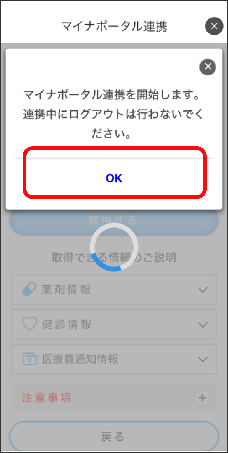 マイナポータル連携画面(下の画像)で、「OK」をタップしても画面に変化がなく、連携できない場合は、スマートフォンの「設定」アプリからデフォルトのブラウザをお確かめください